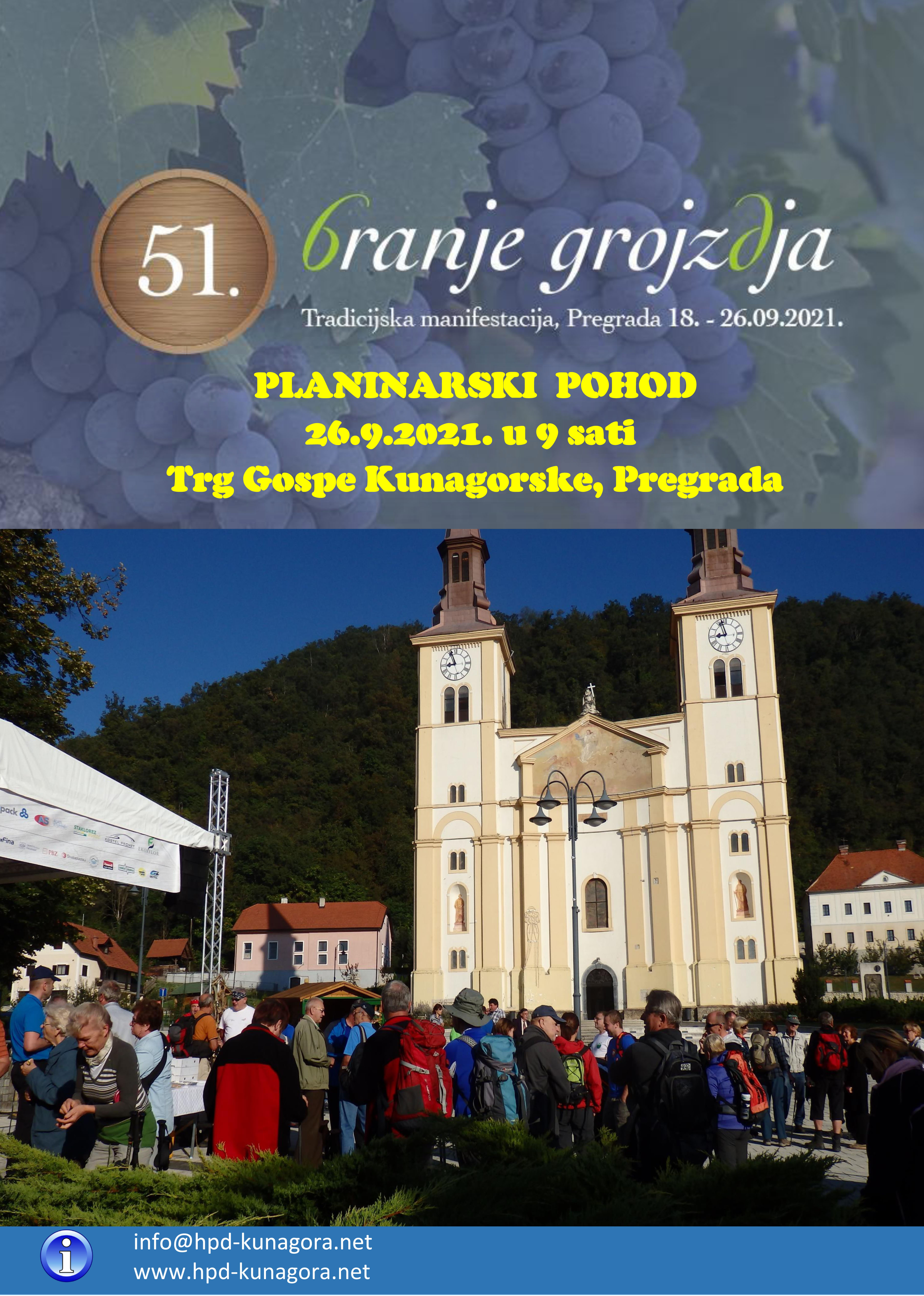 Povodom tradicionalne manifestacije „Branje grojzdja“ koja se održava krajem rujna u Gradu Pregradi, HPD „Kunagora“ Pregrada poziva Vas na tradicionalni planinarski pohod dana 26. rujn…