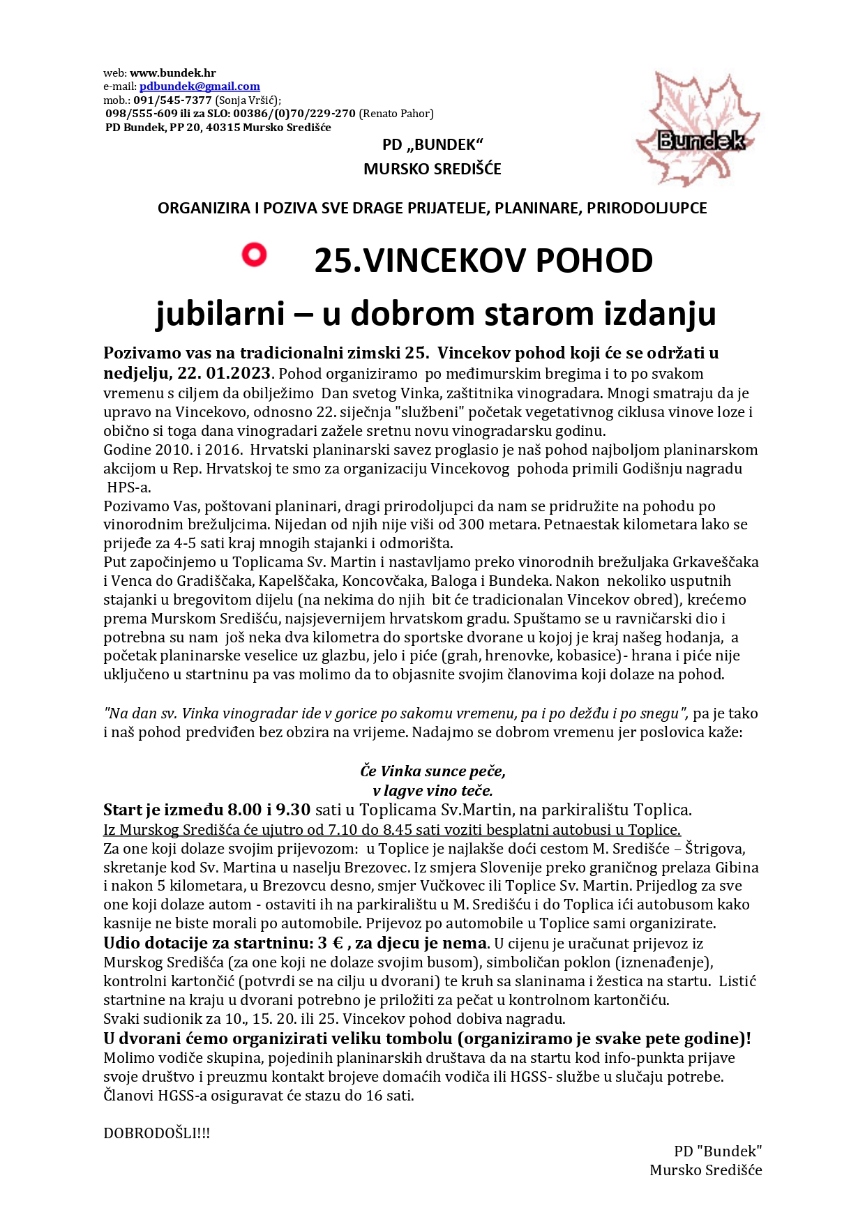 U nedjelju 22. siječnja 2023. godine sa HPD Radoboj organiziramo odlazak na 25. Vincekov pohod PD Bundek u Međimurje.