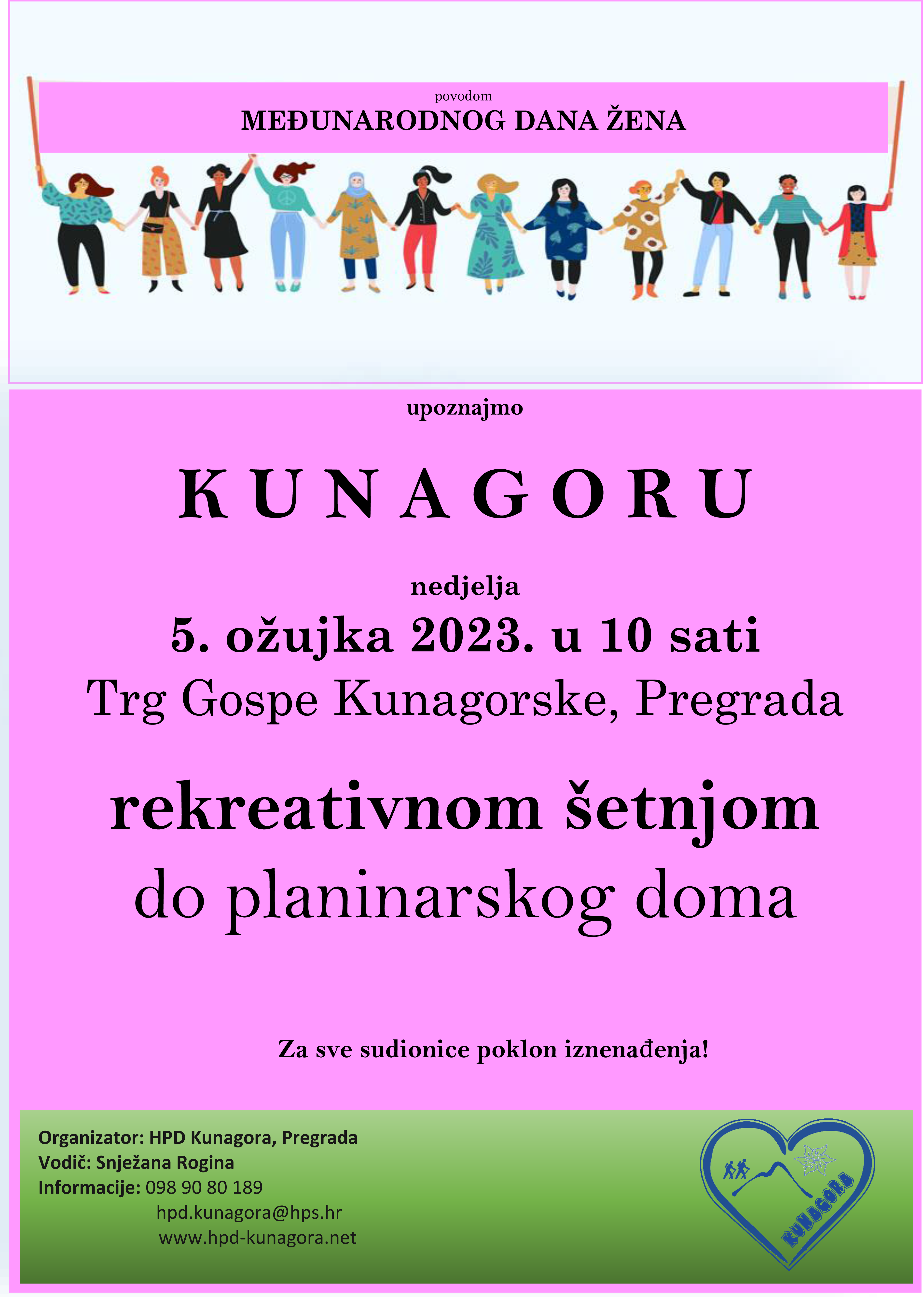 Povodom Međunarodnog dana žena, u nedjelju 5.3.2023. godine, HPD Kunagora organizira planinarsko-rekreativnu šetnju Kunagorom iz Pregrade do Planinarskog doma na Kunagori.