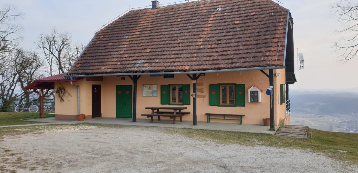 Planinarski dom sa terasom, kapelica MB Kunagorske i pogled na Pregradu.