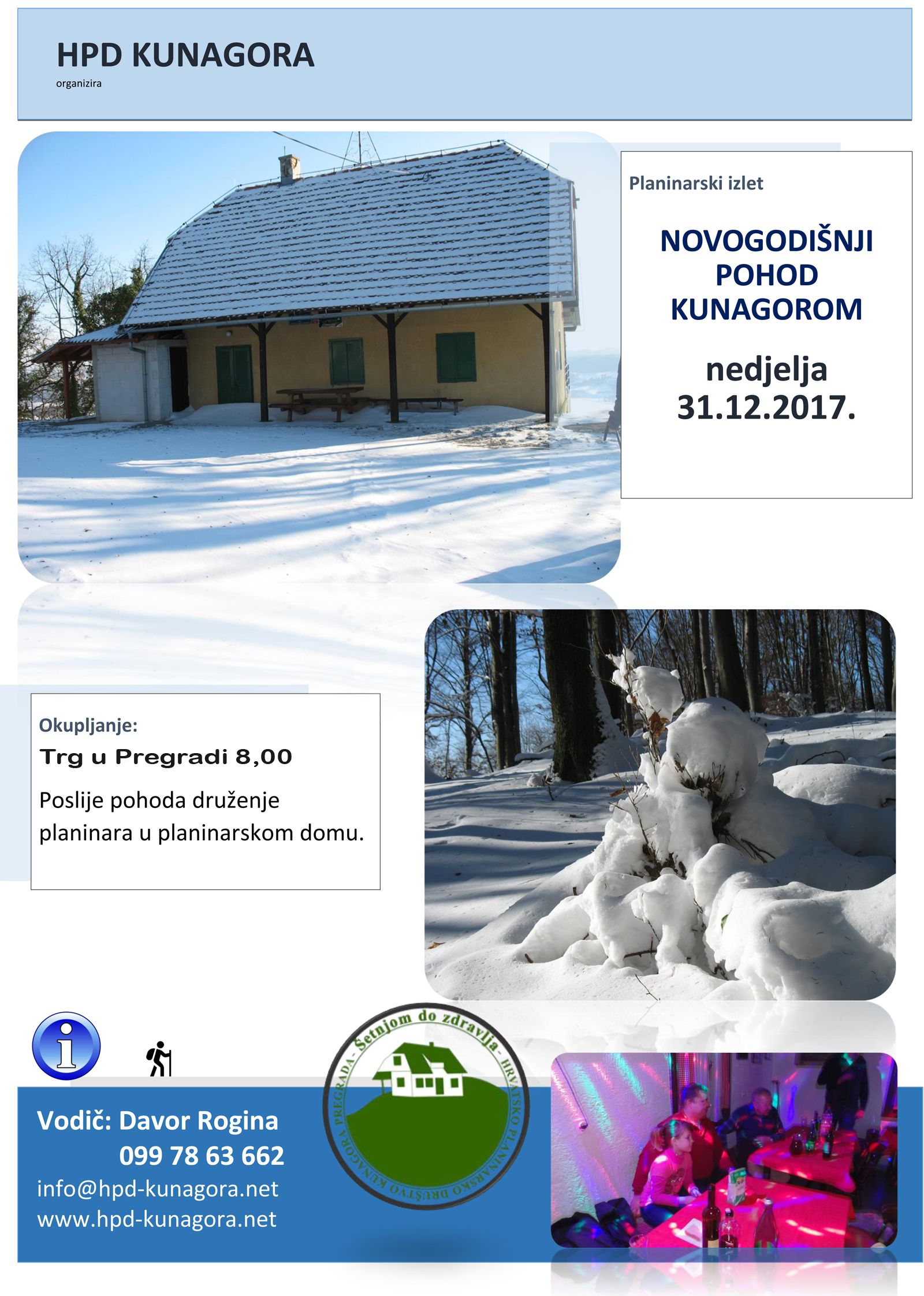 U nedjelju 31.12.2017. godine (na staru godinu) organiziramo tradicionalno novogodišnje planinarsko druženje s pohodom Kunagorom, od Velikog Tabora do Kunagore s druženjem kod planinarskog doma.