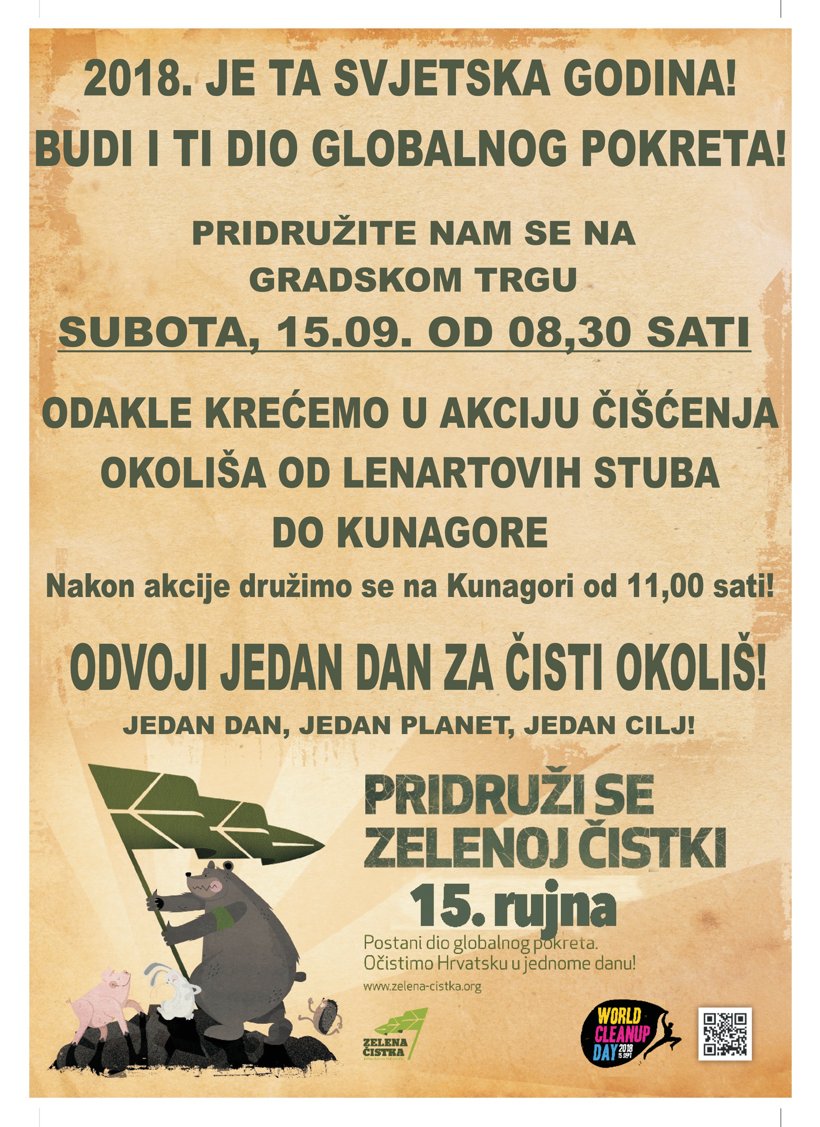 Akcija će se provoditi u subotu 15. rujna 2018. godine s početkom u 8,30 sati na Trgu Gospe Kunagorske. Smjer kretanja: Lenartove stube - Pregrada vrhi - KUnagora. Po završetku akcije druženje se nastavlja na Kunagori u 11 sati gdje će Grad Pregrada pripremiti sendviće i sokove za vrijedne volonterske ruke.