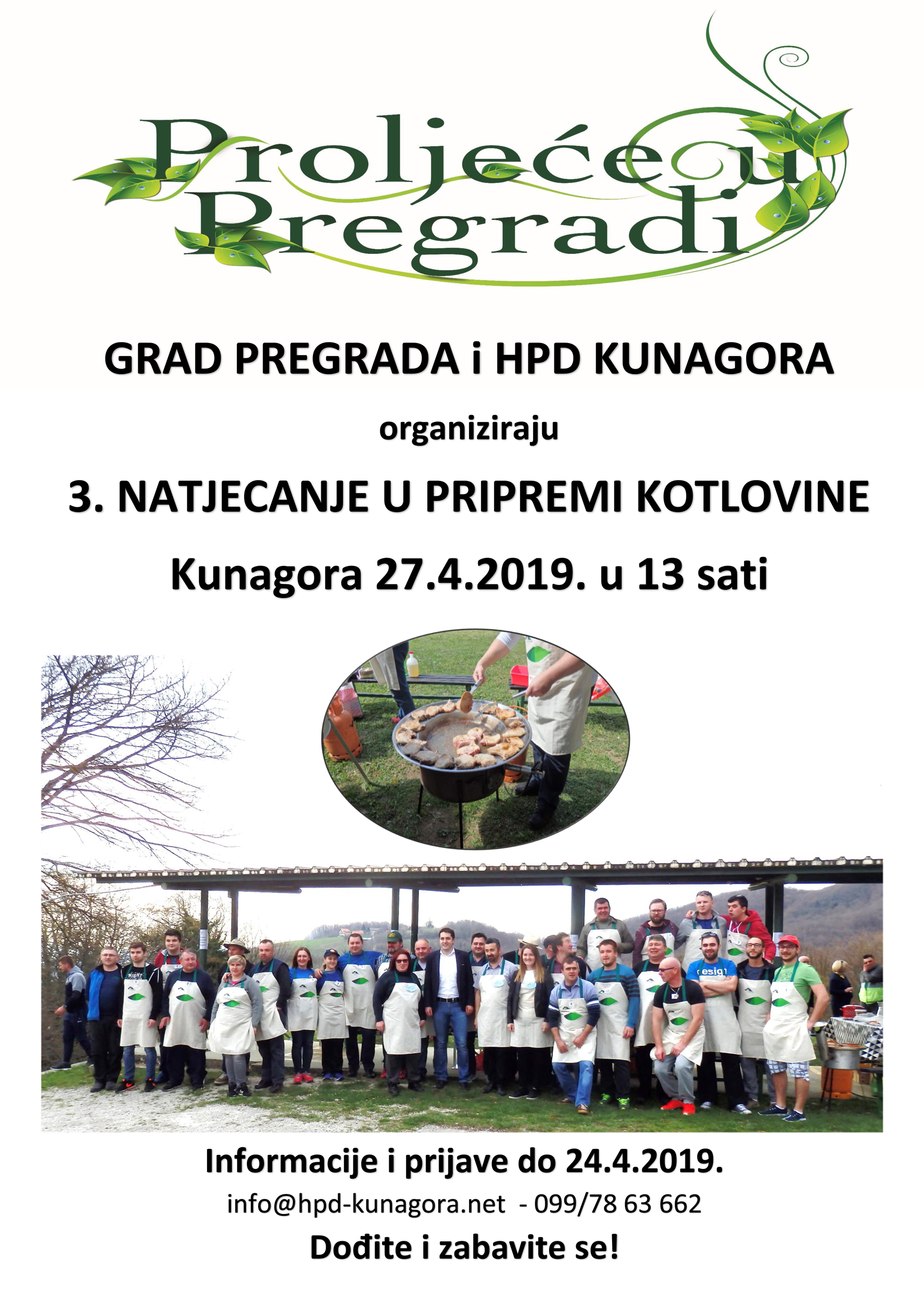 Povodom Dana Grada Pregrade, u subotu 27.4.2019. godine na Kunagori je održano III. natjecanje u pripremi kotlovine. Organizator natjecanja je Grad Pregrada koji je osigurao namirnice za natjecanje te HPD Kunagora čiji su članovi bili domaćini.
