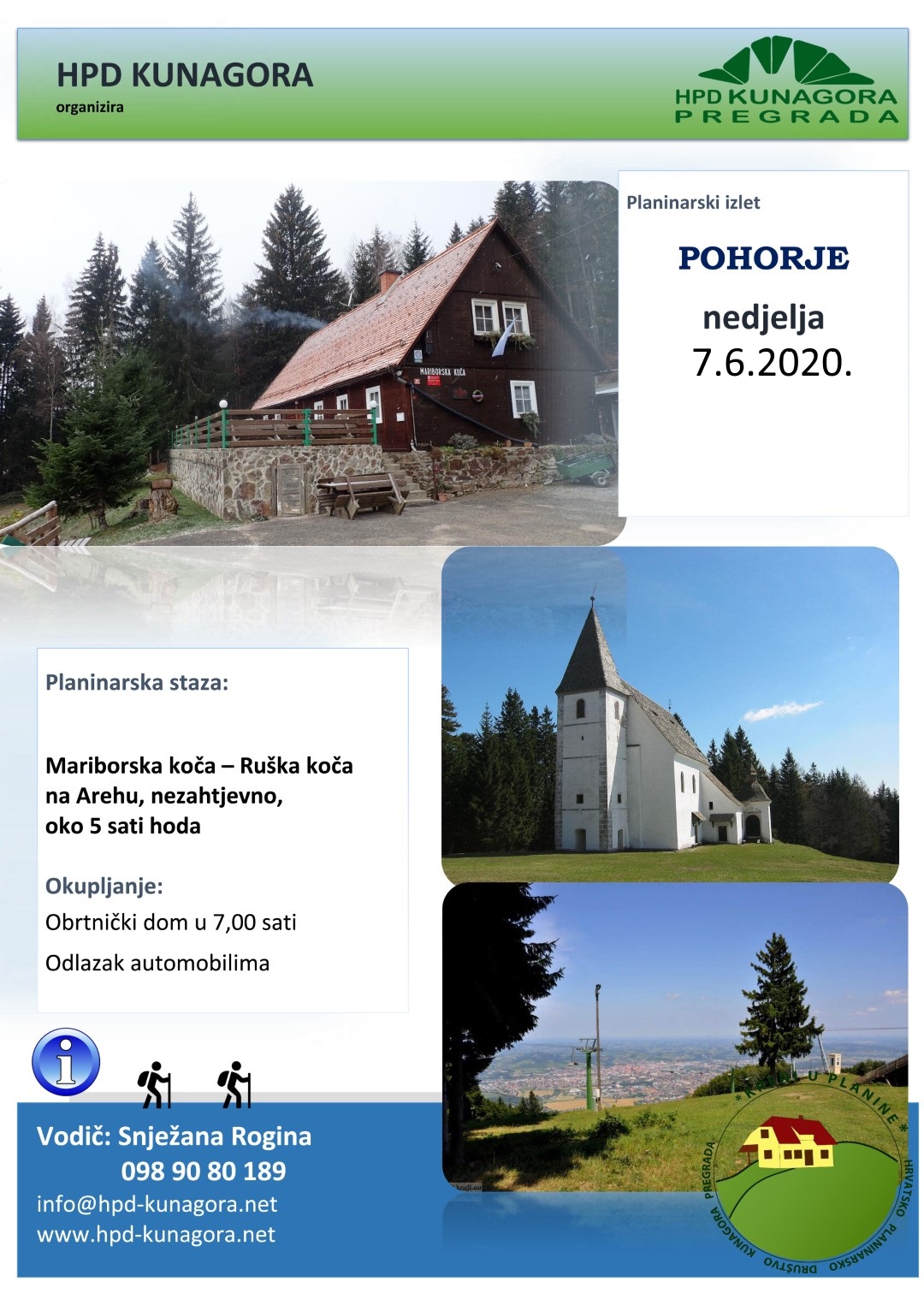 U nedjelju 7.6.2020.g. organiziramo ranije odgođen planinarski izlet u Sloveniju, na Mariborsko Pohorje. Od Mariborske koče (1068m) ćemo se popeti do razgledne piramide, obići okolna skijališta, te potom uputiti do Ruške koče na Arehu (1246m), ukupno oko 1,30h. Zainteresirani će nastaviti do Žigartovog vrha (1346m) koji je udaljen oko 30 min. Mariborska i Ruška koča, te Radvanje su kontrolne točke slovenske planinske poti.